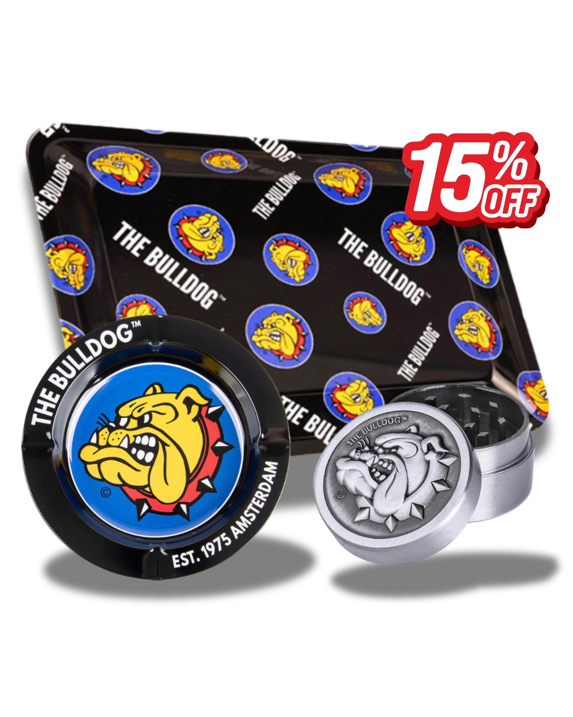 Inclui um tabuleiro metálico com o clássico logo The Bulldog, um cinzeiro resistente e um grinder em metal de dentes afiados. Tudo com aquele toque especial que só a Bulldog sabe dar. E o melhor? Está com 15% de desconto. Não deixes passar esta oportunidade! Coleção limitada.